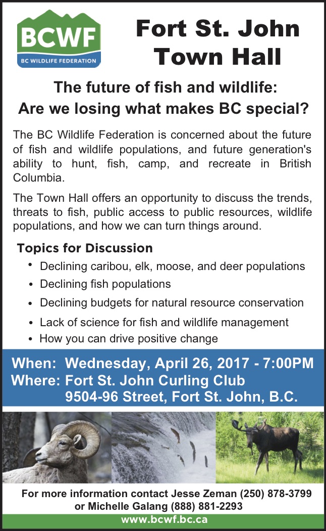 The BC Wildlife Federation and the North Peace Rod and Gun Club will be hosting a town hall meeting at 7 PM on Wednesday, April 26, 2017 at the Fort St. John Curling Rink.